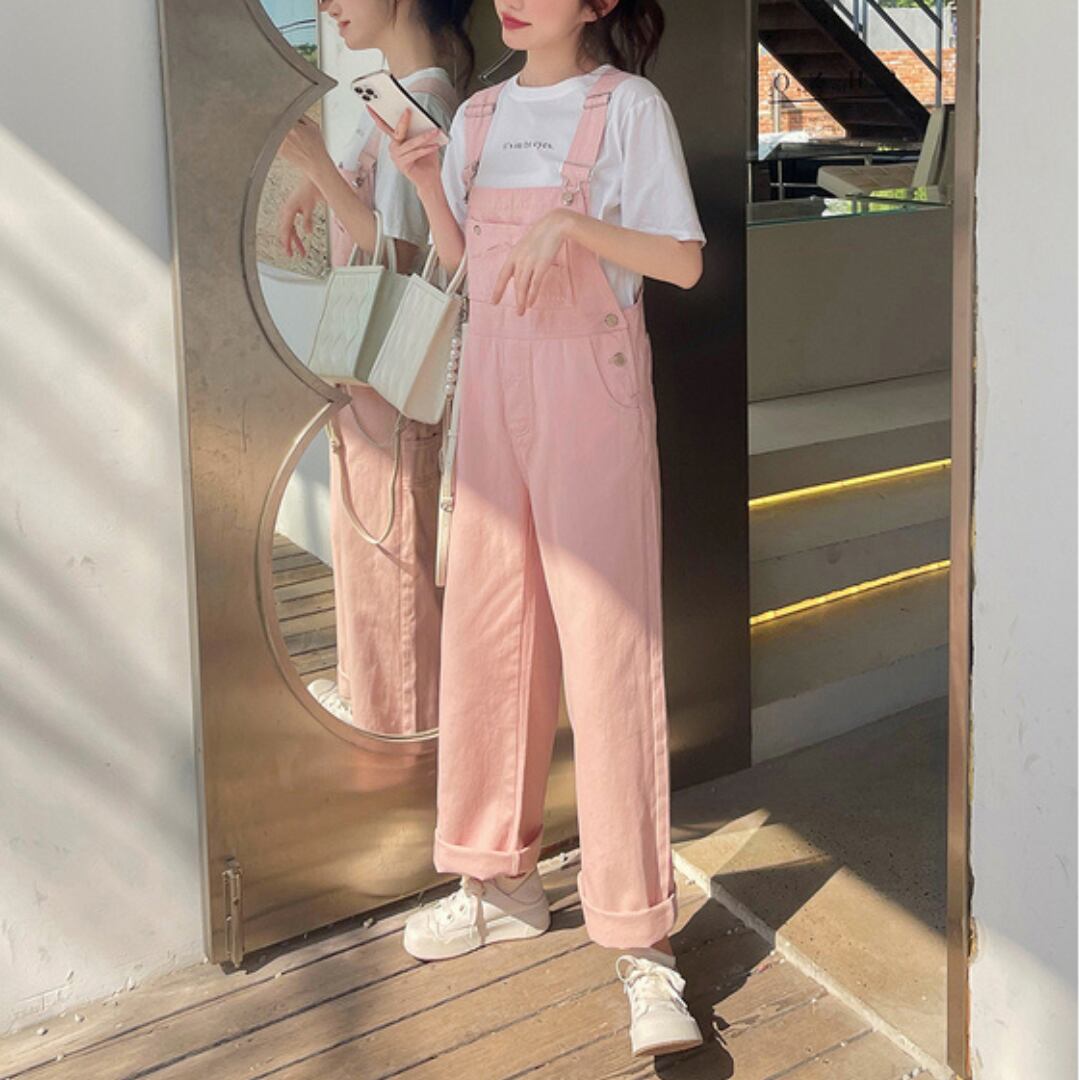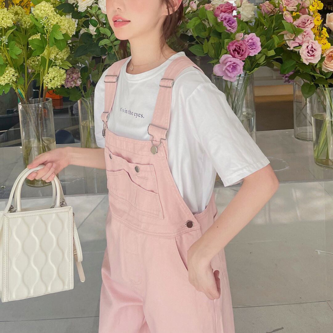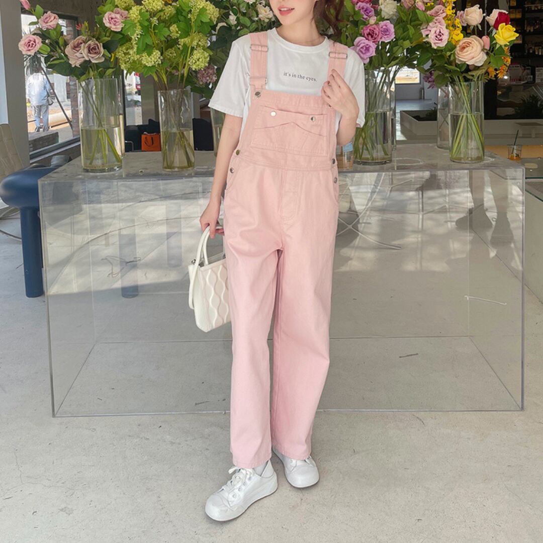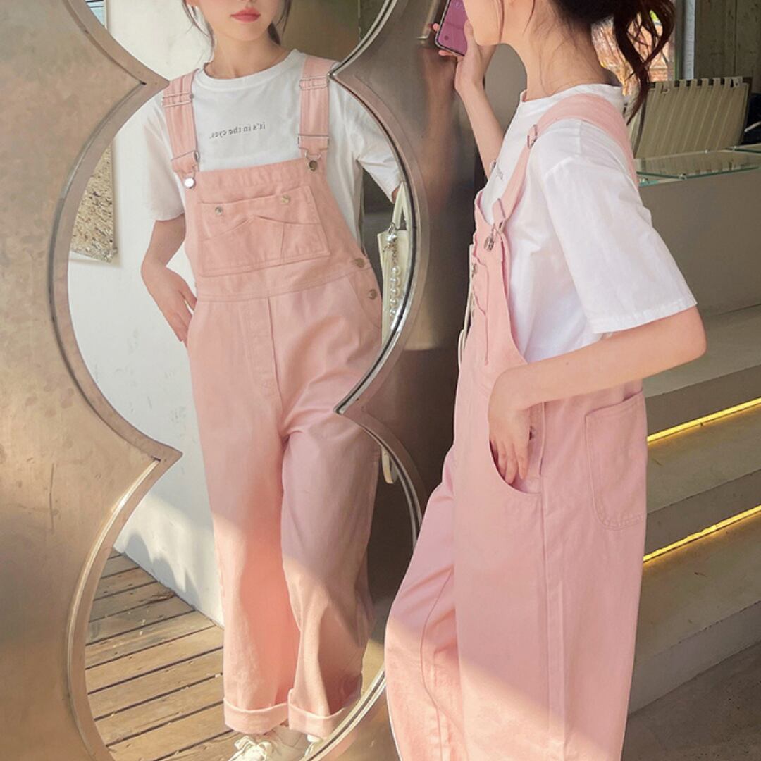 夏にぴったりの薄手のピンクデニムオーバーオール。