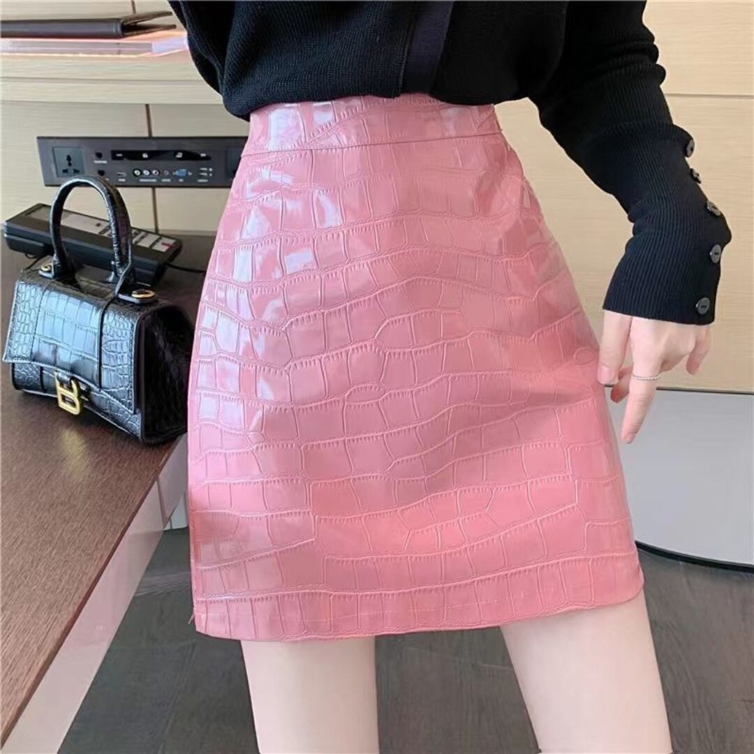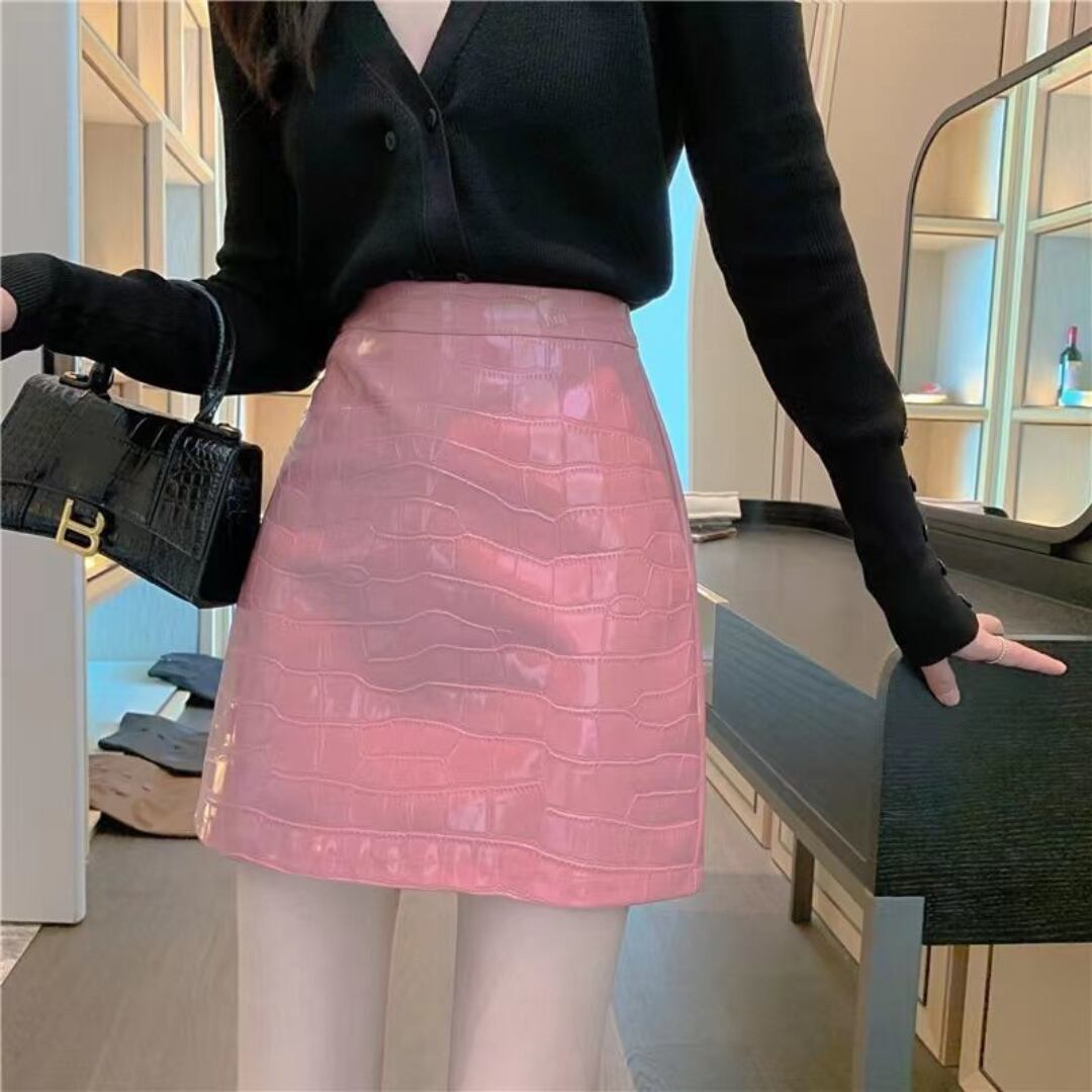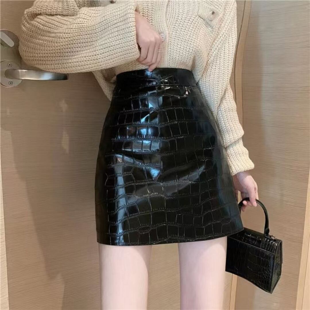 ・PUレザーのエンボス加工、スリムなハイウエストAラインスカート、セーターとの相性抜群!