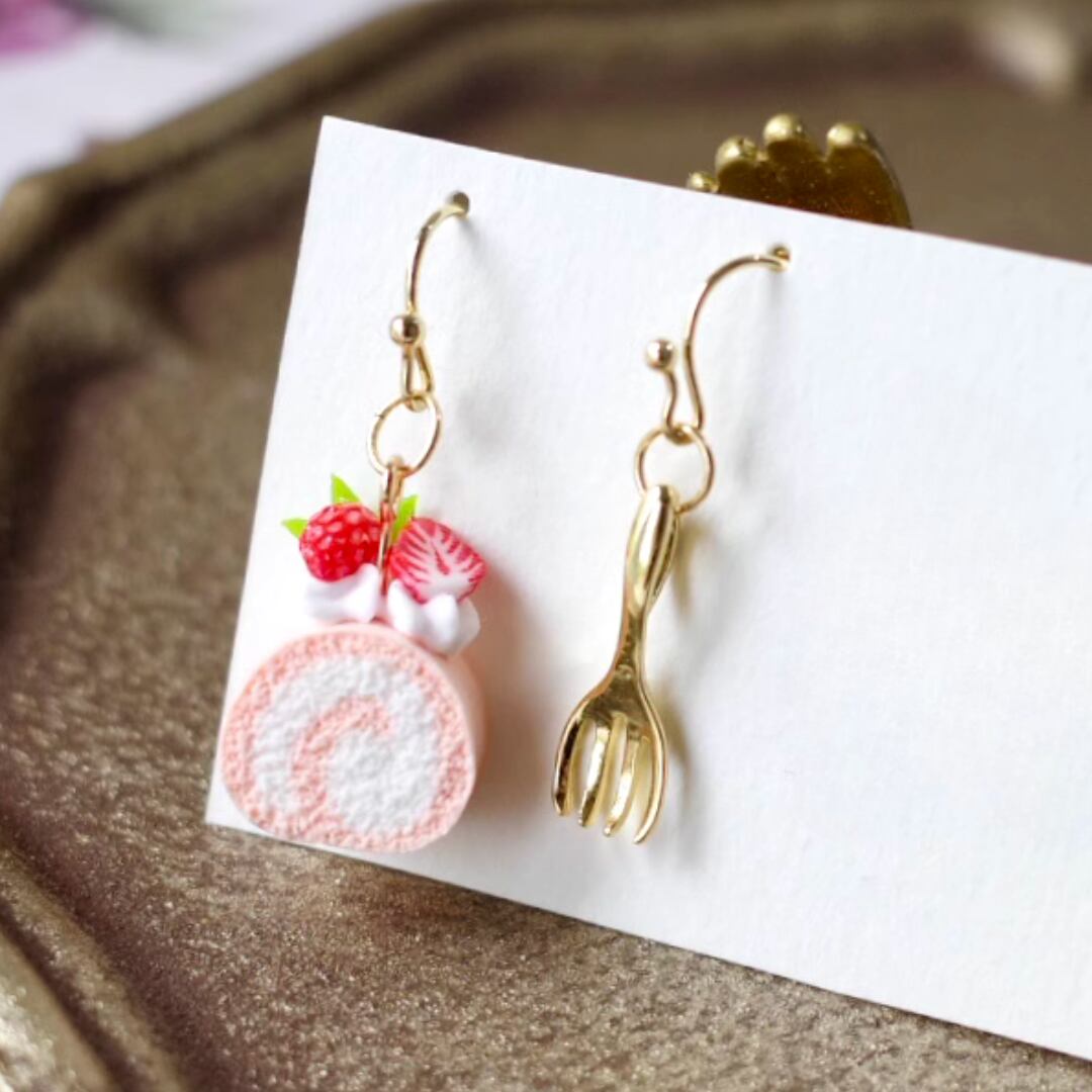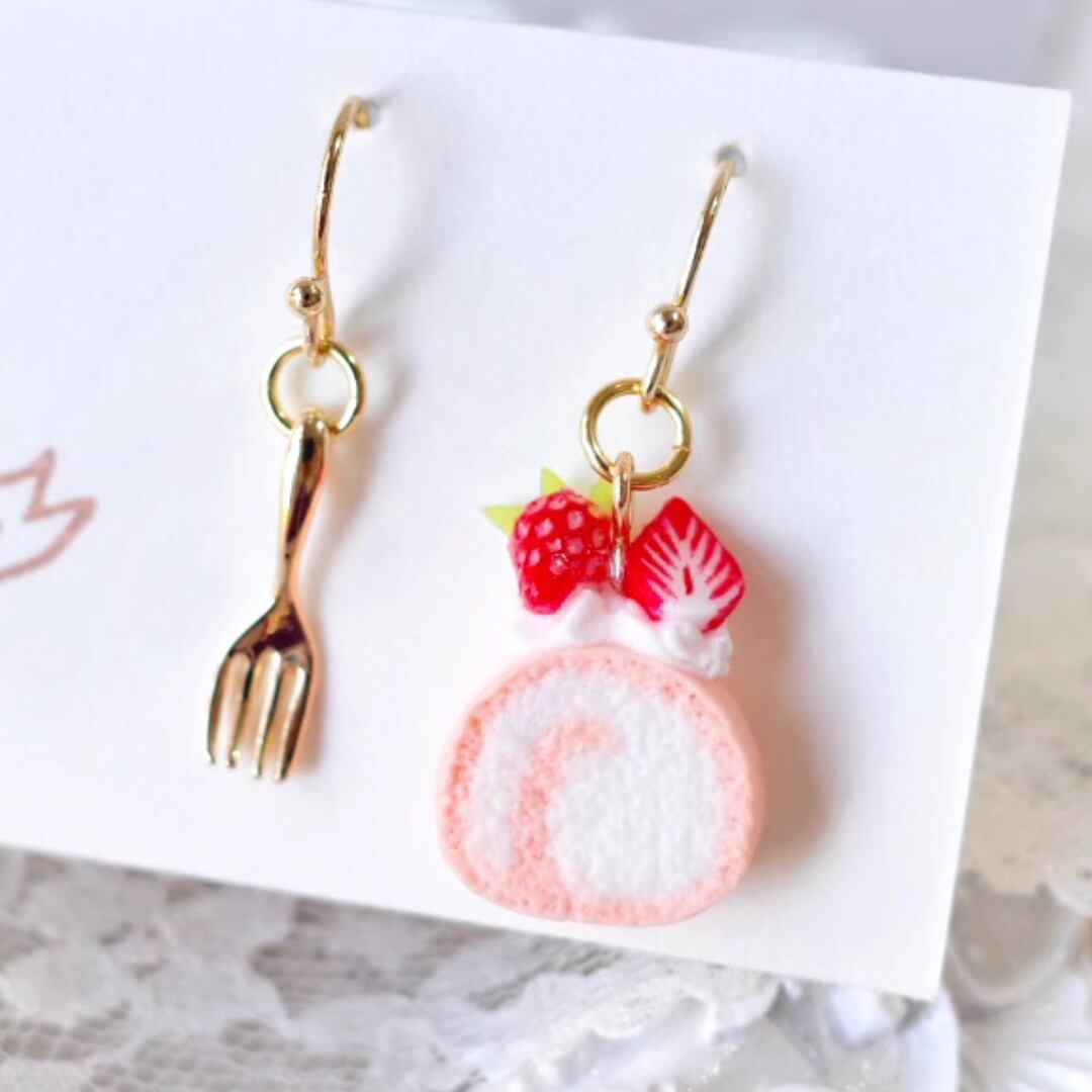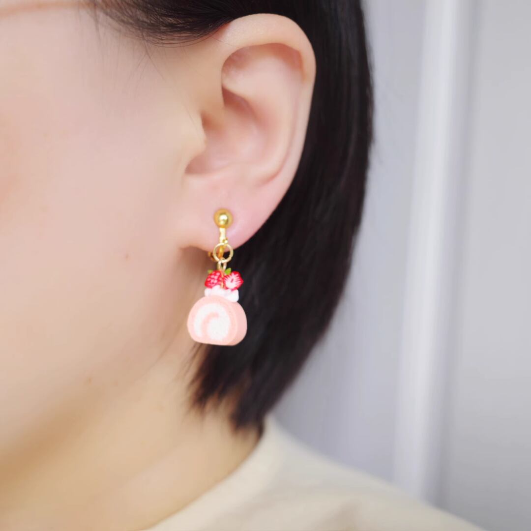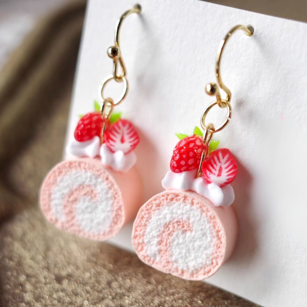 ・手作りのいちごクリームロールケーキイヤリングは、午後のお茶会に最適です。