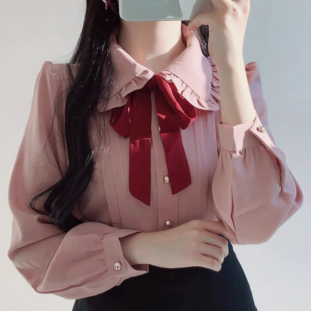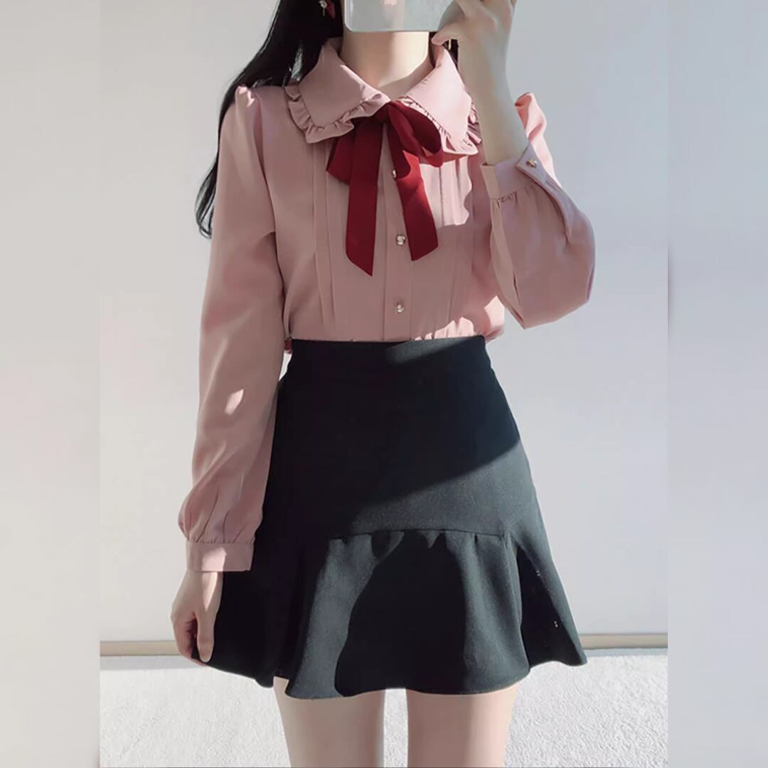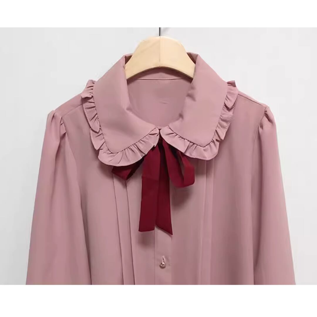 ・長袖デザインで、春の変わりやすい気候にも対応。蝶々結びのディテールが上品さを演出します。